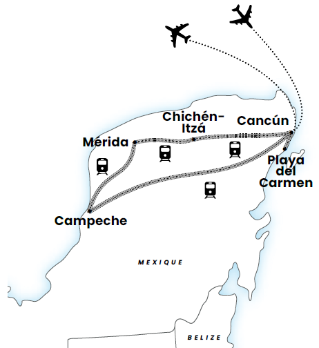 Voyager en train à travers le Yucatan ! Une autre façon de découvrir les fabuleuses cités mayas, classées par l'UNESCO ainsi que la belle architecture coloniale de Mérida et Valladolid avec, en toile de fond, de splendides paysages qui défileront sous vos yeux.