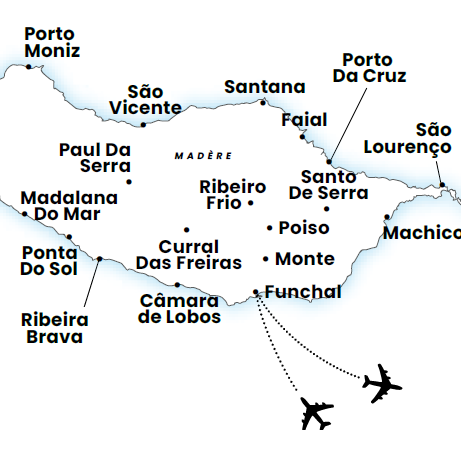 - Le transport aérien France / Funchal / France sur compagnie régulière ou low cost (vols avec ou sans escale et changement d’appareil)