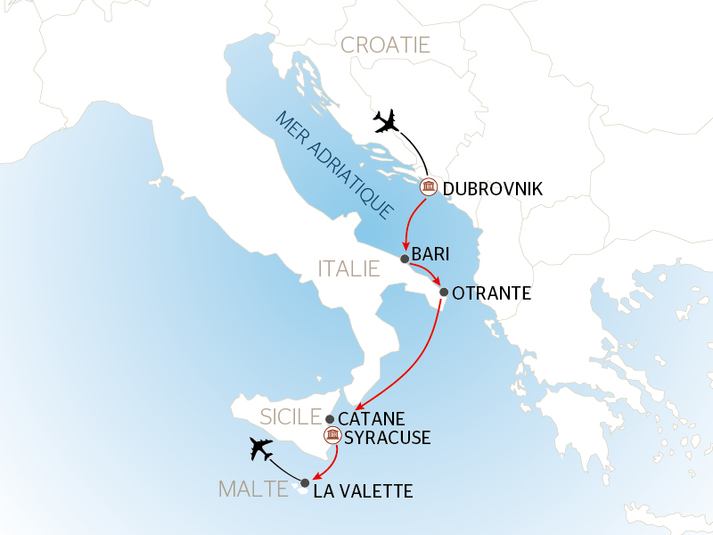 Embarquez pour une croisière enchanteresse à la découverte de la beauté intemporelle de la Croatie et de la magie de l'Italie du Sud, en passant par les trésors de la Sicile et les rivages ensoleillés de Malte. C’est à Dubrovnik que débutera votre croisière où vous tomberez sous le charme de l’ancienne cité de Raguse. Vous débuterez votre traversée vers la pittoresque région des Pouilles, où vous serez captivé par ses trésors architecturaux et la richesse de sa nature. Explorez la vibrante Bari, la pittoresque Lecce et la séduisante ville d’Alberobello, célèbre pour ses « trulli ». Cap vers la côte sicilienne qui vous plongera au cœur de ses vestiges ancestraux et où vous découvrirez des paysages authentiques, tel que le majestueux mont Etna et la pittoresque presqu’île d'Ortigia. Pour couronner cette croisière, vous découvrirez l’île somptueuse de Malte en explorant La Valette, magnifique cité des chevaliers, qui vous dévoilera un patrimoine riche et fascinant.