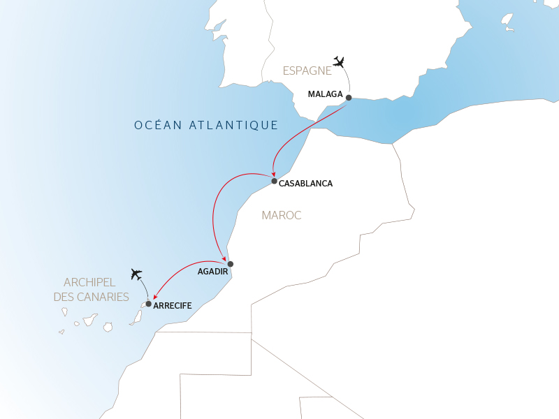 Embarquez pour unecroisière unique le long des côtes atlantiques à la découverte du Maroc, entretradition vivante et splendeurs patrimoniales. Casablanca et sa majestueusemosquée Hassan II, Rabat l’impériale et ses remparts d’or, ou encore Marrakech,vibrante et colorée, dévoileront tour à tour leurs trésors. De la place JemaaEl-Fna aux jardins de Majorelle, des remparts de Taroudant à la palmeraie deTiout, chaque escale est une immersion dans un monde où les senteurs d’épices,les zelliges ciselés et les chants andalous composent une inoubliable symphonieorientale. À bord, conférences, dégustations et soirées animées prolongentl’expérience avec élégance. Une parenthèse fascinante entre culture,authenticité et art de vivre marocain.