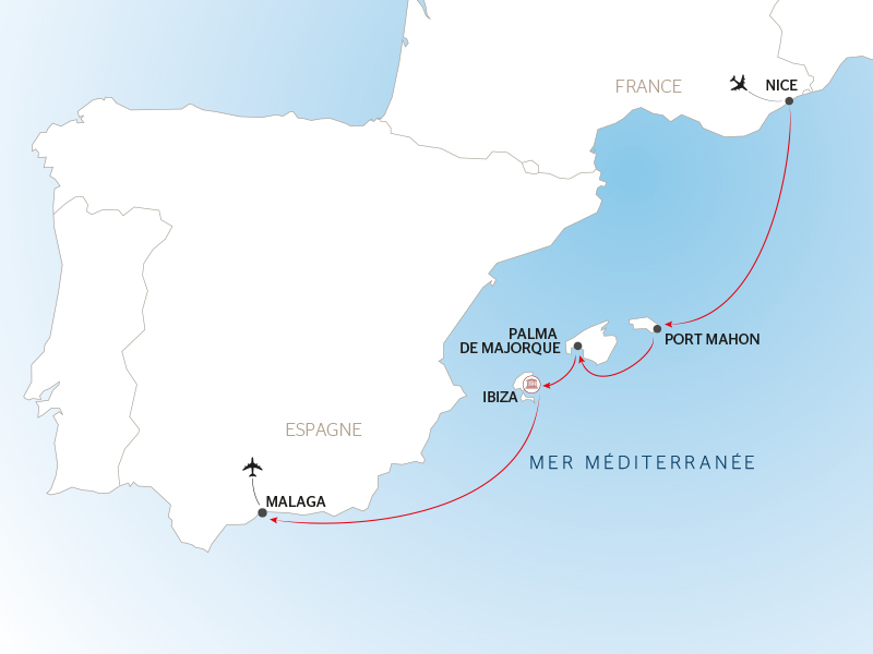 Vol(1) vers Nice, transfert et embarquement à 18h. Présentation de l'équipage et cocktail de bienvenue. Dîner à bord et départ en croisière vers l’archipel des Baléares.