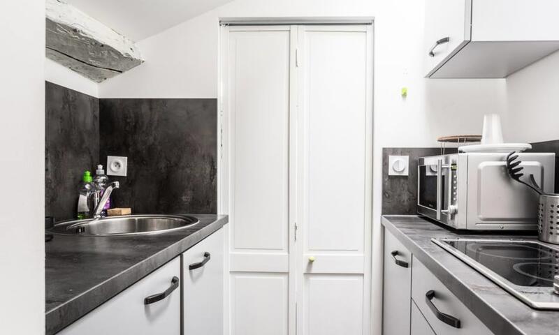 Cuisine équipée ouverte, salon avec canapé-lit, salle d'eau.