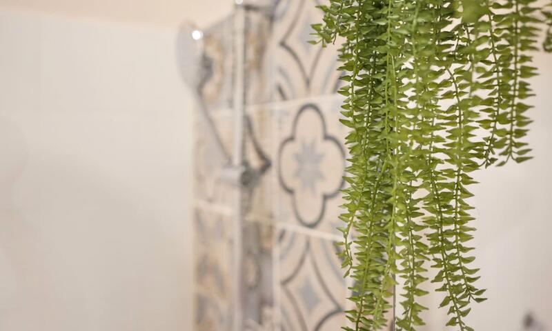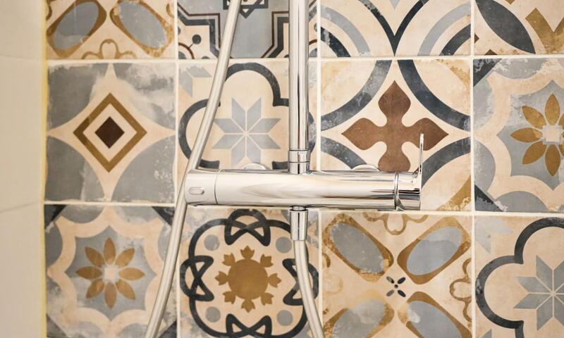 Une salle de bain sur mesure avec sa douche à l’italienne aux carreaux de ciment distingués, son meuble en bois et un sèche-serviettes pour vous sentir enveloppé dans un petit nuage chaud en sortant.