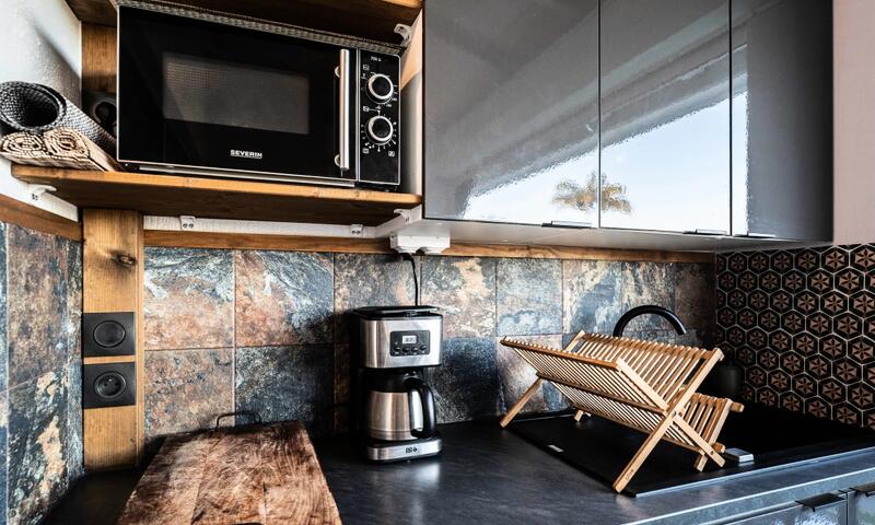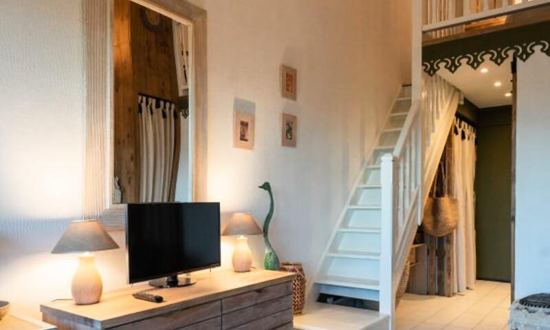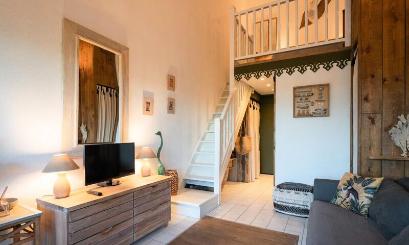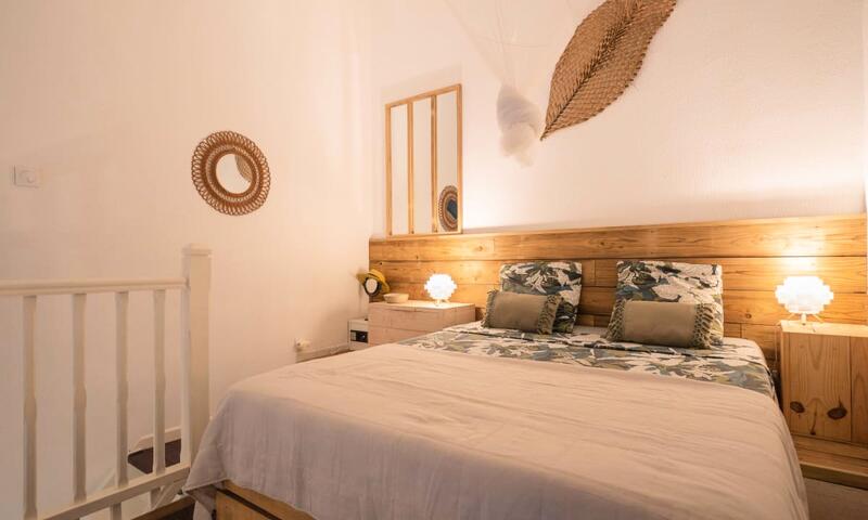 Une chambre en mezzanine meublée d'un lit en 160 pour une intimité parfaite et un canapé-lit en 160 dans le séjour pour des couchages supplémentaires. Il peut idéalement accueillir 2 adultes et 2 enfants/ados.
