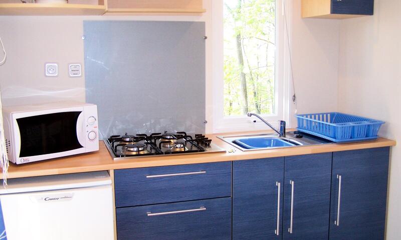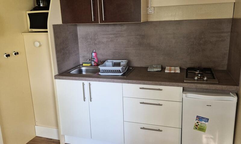Cuisine : plaque (4 gaz), frigo top 100L, micro-ondes, cafetières, kit vaisselle 5 pers