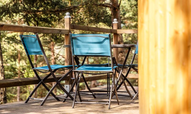 Cette tente de 25m² permet d'accueillir 5 personnes. Elle est équipée d'une terrasse de 13.50m² avec salon de jardin et possède un séjour avec coin cuisine, 1 salle de douche avec WC et 2 chambres.
