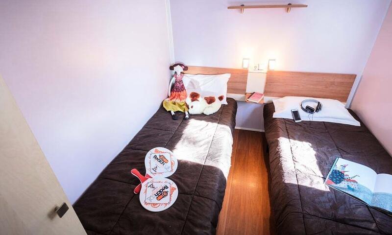 - Séjour (partie couchage) : Banquette - Lit : 130 x 190 cm (le couchage ne convient pas à des personnes de plus de 15 ans)