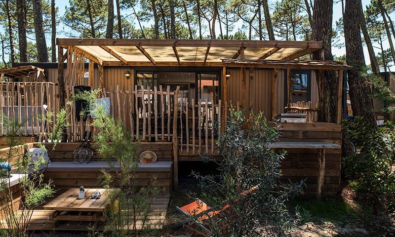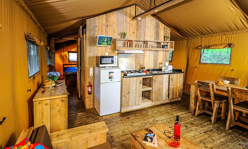 Cette tente est composée d'une chambre avec lit double, d'une chambre avec lit double et 1 lit simple en hauteur, d'un coin cuisine équipé (réfrigérateur-congélateur, micro-ondes, cafetière, grille pain...), d'une salle d'eau avec douche, lavabo et WC séparés.