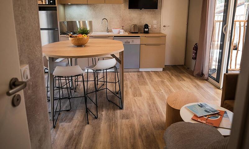 Ce chalet est composé d'une chambre avec lit double, d'une chambre avec 2 lits superposés et 1 lit simple, d'un coin cuisine équipé (réfrigérateur, micro-ondes, cafetière, lave-vaisselle...), d'une salle d'eau avec douche, lavabo et WC séparés.