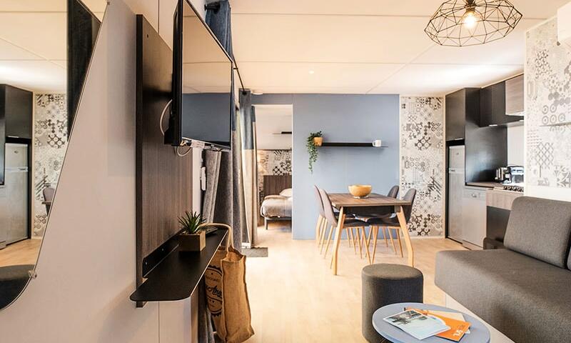 Ce mobil-home est composé de deux chambres avec lit double, de deux chambres avec 2 lits simples, d'un coin cuisine équipé (réfrigérateur, micro-ondes, cafetière, lave-vaisselle, grille pain...), d'une salle d'eau avec douche, lavabo et WC séparés.