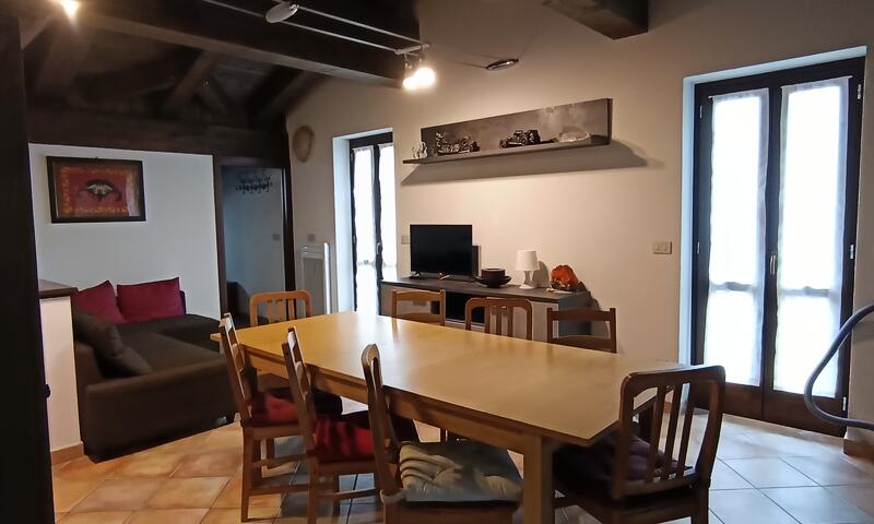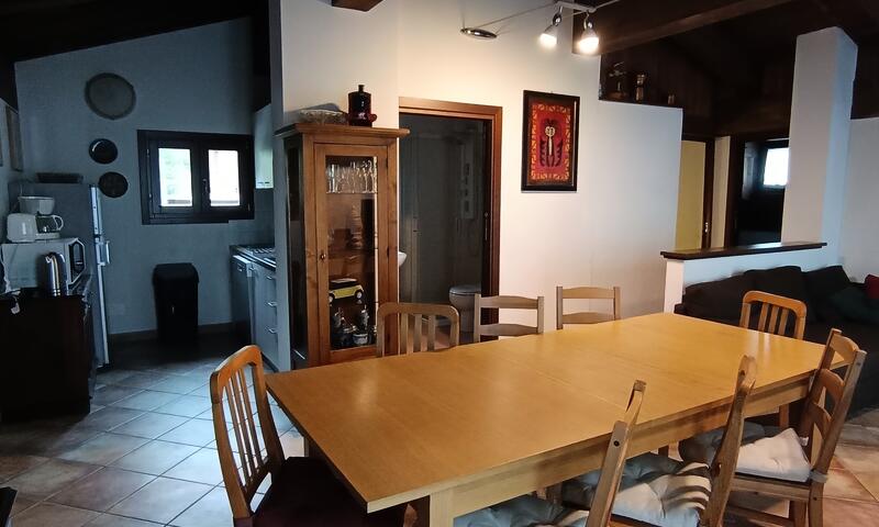 Séjour : Canapé, télévision, buffet, coin repas pour 8 personnes.