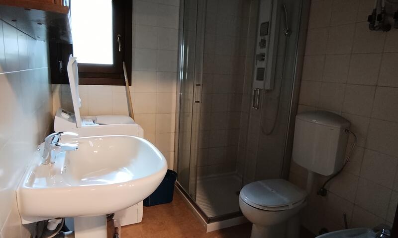 Salle d'eau : Cabine douche, WC, meuble avec vasque, bidet, placard, lave-linge.