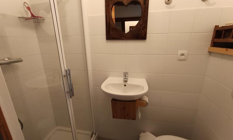 Salle d'eau : Cabine douche, lavabo, miroir, wc, étagère, sèche-serviettes électrique mural.