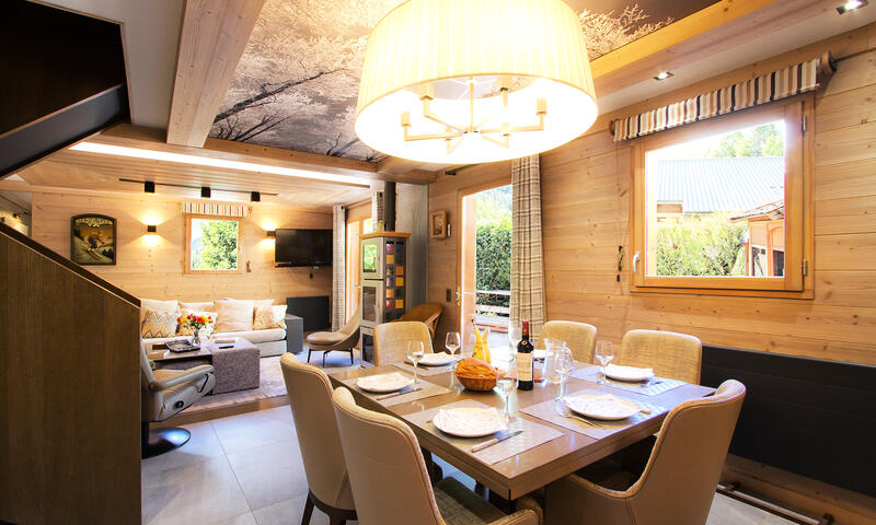 Une chambre avec 2 lits simples superposés, un séjour avec poêle à bois, télévision à écran plat, une grande salle à manger, cuisine équipée d'un lave-vaisselle, lave-linge et appareil à raclette