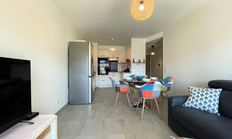 - un salon-séjour donnant accès à la terrasse. La terrasse est équipée d'une petite table et de 4 chaises.