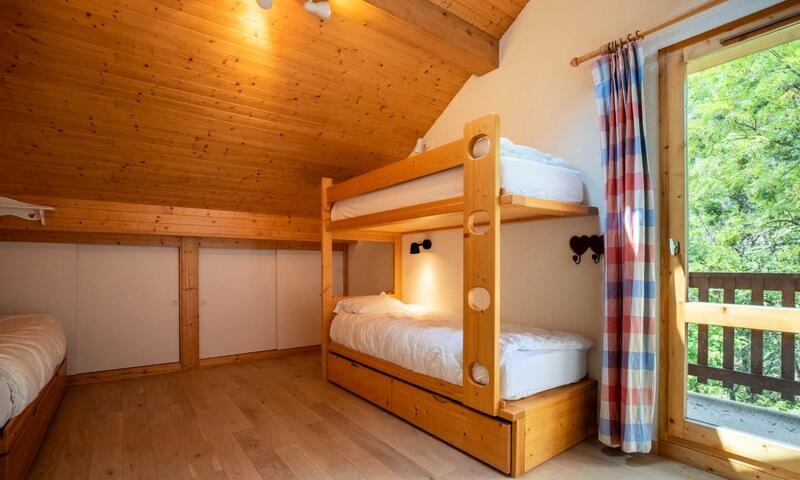 A l'étage, deux chambres : l'une avec un ensemble de lits superposés et deux lits simple utilisable en double si besoin. L'autre avec un lit 160 et un petit bureau, pratique pour le télétravail. Entre les deux : une salle de bain avec baignoire et wc.