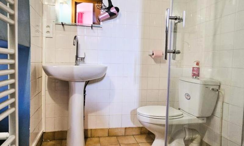 Quelques marches mènent à une salle d'eau avec douche et des WC communs, suivie d'une seconde chambre avec un lit de 140 cm, toutes deux entre les niveaux.