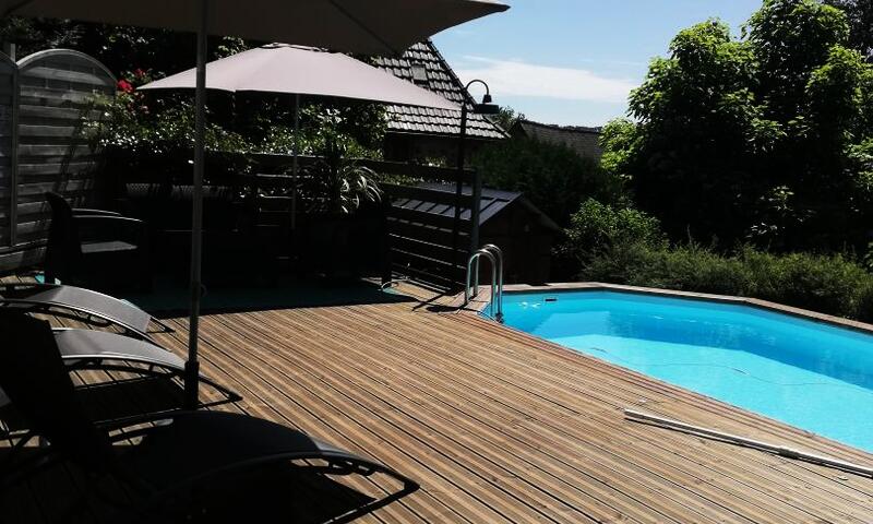 La vue se déploie sur de charmants jardins, embellie par une piscine extérieure hors sol, qui n'est pas chauffée. Cet ensemble est complété par une grande terrasse en bois privée de 9 par 5 mètres, créant un espace idéal pour se détendre et s'évader au cœur de la nature, tout en appréciant le cadre environnant.