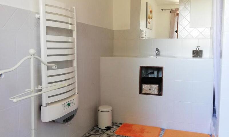 Vous devrez descendre quelques marches pour atteindre au gîte. En entrant, vous serez accueilli par un petit hall d'entrée qui vous orientera vers une salle d'eau, équipée d'une douche et de toilettes communes. En montant quatre marches, vous découvrirez un espace de vie agréable, composé d'un salon, d'un séjour et d'une cuisine. De plus, une chambre confortable vous attend, dotée d'un lit de 160 cm, offrant une vue apaisante sur le jardin et la piscine, avec des moustiquaires sur les deux fenêtres pour votre confort.