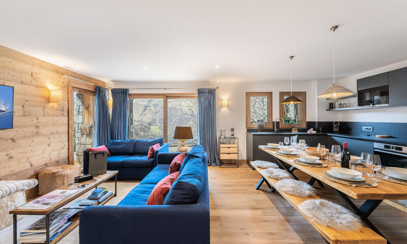 Appartement LE BOUQUETIN - LES CHALETS DU CHEVAL NOIR n° B5, 4 pièces cabine avec 3 chambres pour 8 personnes 100m², orienté Ouest une terrasse rez de jardin et un jardin avec vue panoramique sur la vallée.