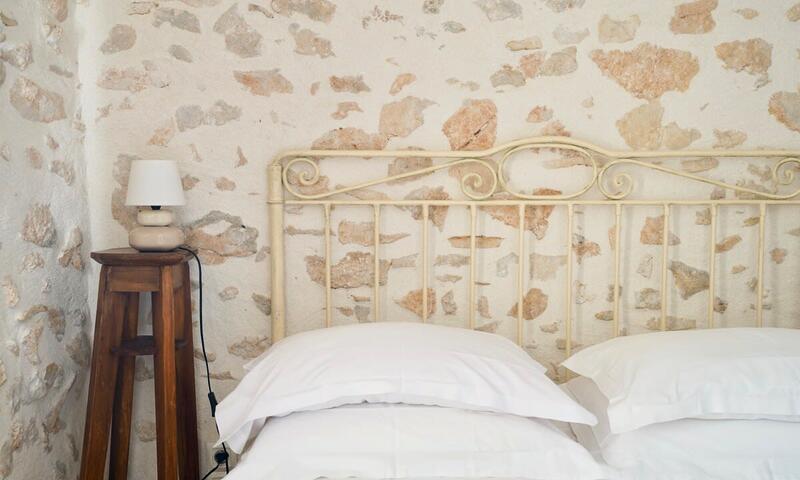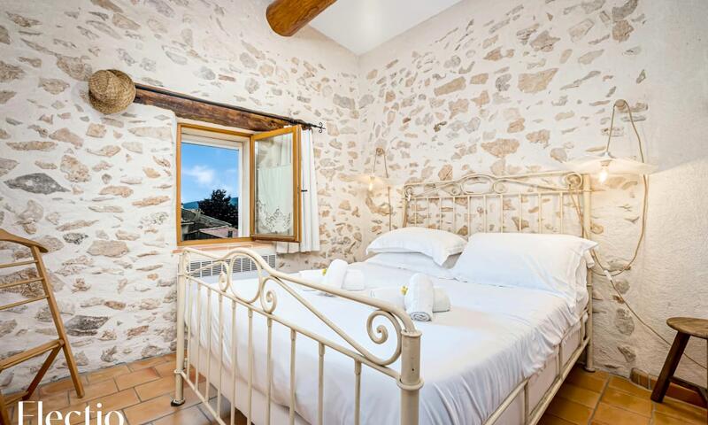 La seconde chambre, exposée au sud, est équipée d'un lit de 140×190 et d'un portant en bois. Le mur en pierres, agrémenté de lampes en papier mâché au-dessus de tabourets servant de tables de nuit, crée une atmosphère apaisante et unique. Depuis cette chambre, vous pourrez profiter d'une vue charmante sur les toits et la chapelle du hameau.
