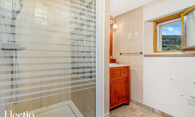 La salle d'eau, réalisée en maçonnerie et bois, dégage une atmosphère authentique. Profitez d'une douche équipée de jets relaxants grâce à la technologie Grohe SmartControl. La salle d'eau comprend un meuble vasque avec mitigeur, un grand miroir, des rangements pratiques et un sèche-serviettes. Un sèche-cheveux, un fer et une planche à repasser sont également à votre disposition. Pour plus de commodité, la machine à laver se trouve dans la buanderie, et vous pouvez étendre votre linge sur l'étendoir extérieur.