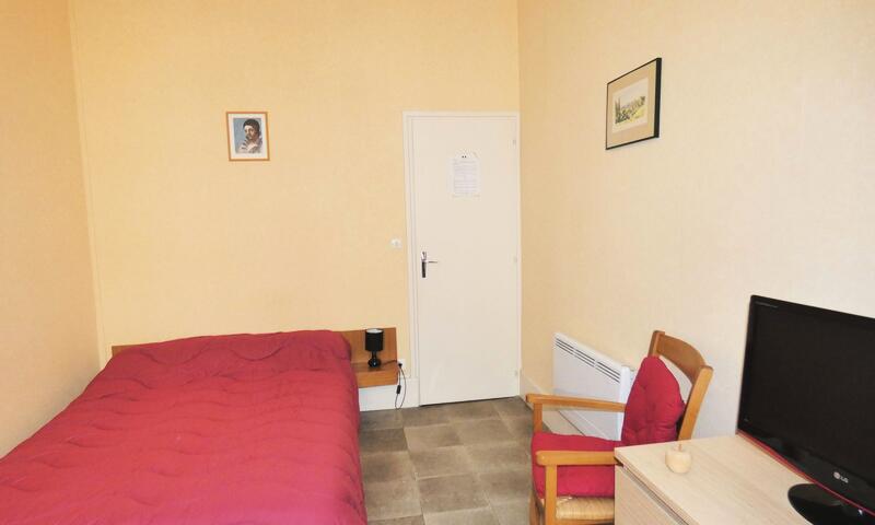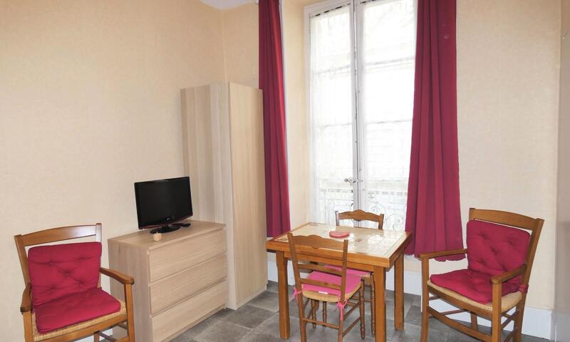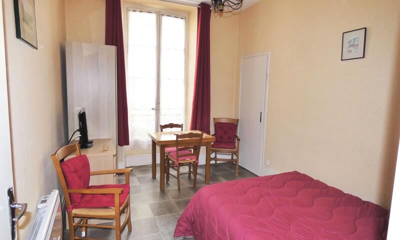 Pièce principale ouverte par 1 fenêtre (sol PVC) : 1 lit de 140 avec chevet, 1 armoire, 2 fauteuils, 1 table, 2 chaises, 1 commode 3 tiroirs, 1 chiffonnier 2 tiroirs, 1 télévision écran plat