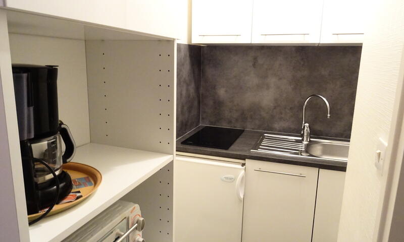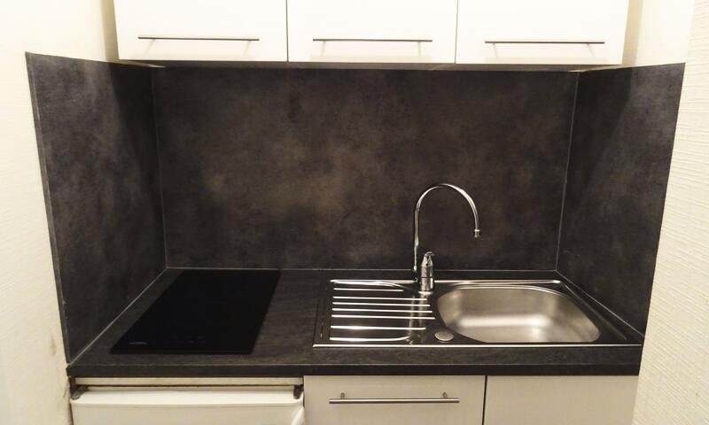 Cuisinette (sol PVC) : 1 évier, 2 plaques électriques, 1 réfrigérateur, micro ondes, 1 mini four, meuble rangement, cafetière, grille pain, bouilloire électrique,vaisselle et batterie de cuisine