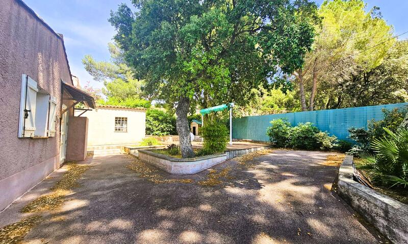 Grand séjour ouvert sur une belle véranda avec mur végétal, cuisine US équipée, buanderie, terrasse ombragée, jardin, parking voiture sous tonnelle, portail électrique.