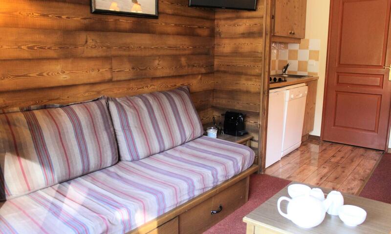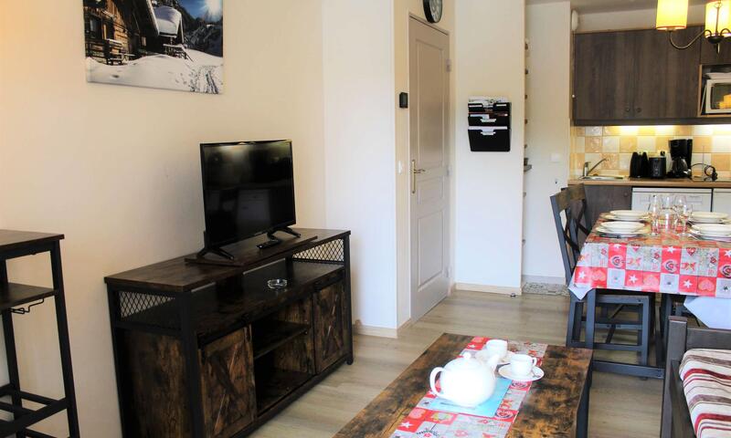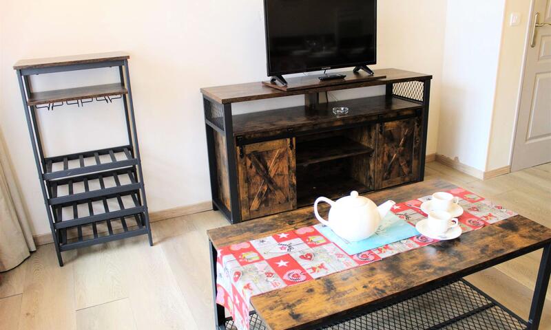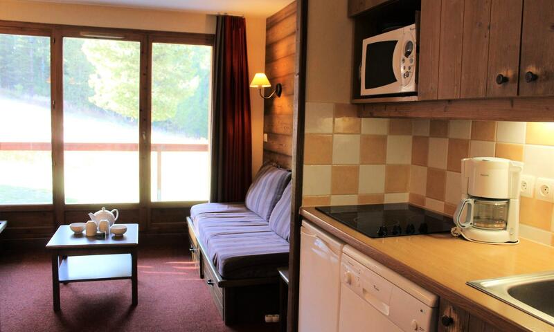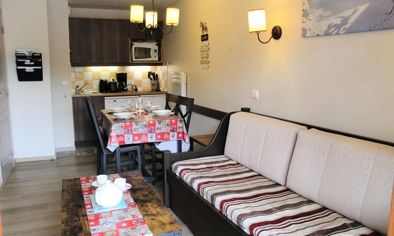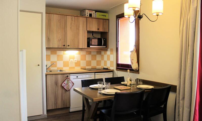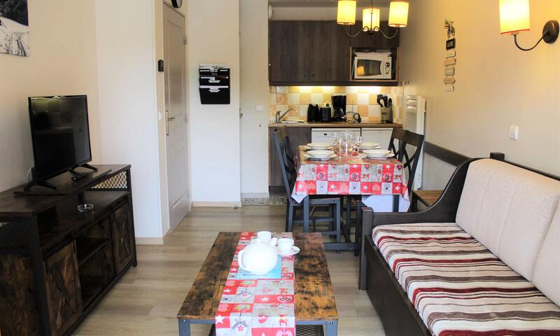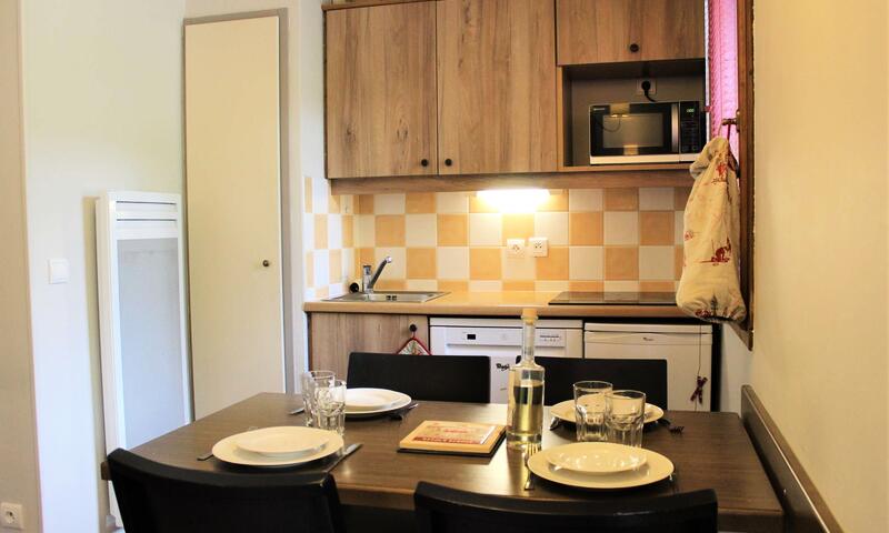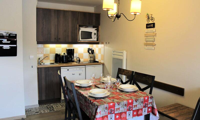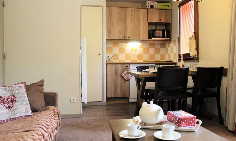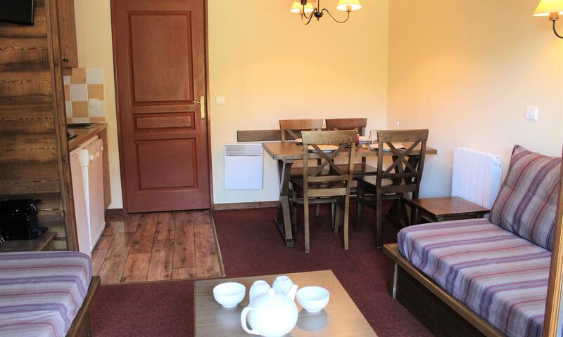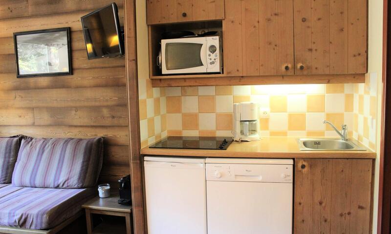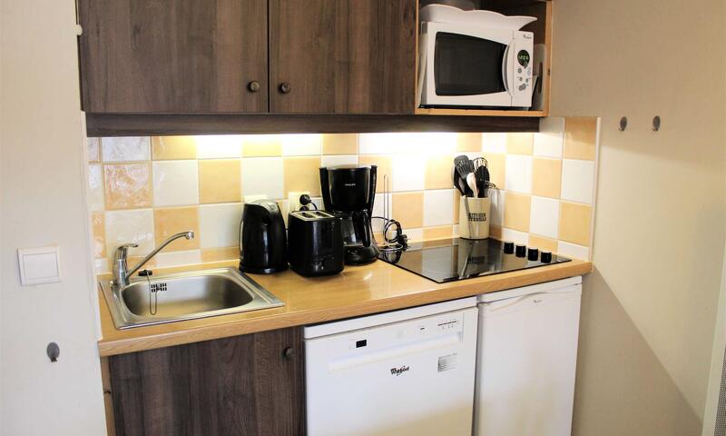 Cette location en station de ski se compose d'un coin cuisine ouvert sur un séjour comprenant un coin repas et deux lits gigognes une place. Vous disposez d'une chambre avec un lit double en 140, d'une salle d'eau avec douche et de WC séparés.