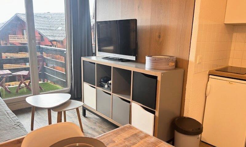 Situé sur le haut de la station et proche des pistes, l'appartement est composé dans l'entrée: d'un lit superposé (2 couchages simples), dans le séjour: d'un lit gigogne et dans une cabine avec fenêtre, séparée du séjour par une porte coulissante, d'un lit gigogne. Les banquettes-lits gigognes peuvent faire un couchage de 160x190. L'appartement comprend aussi une cuisine équipée, une salle de bain avec baignoire et un WC indépendant. Il dispose aussi d'un casier à ski.