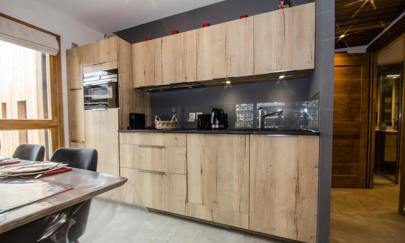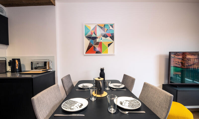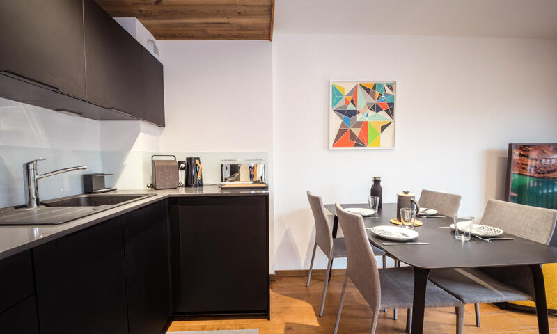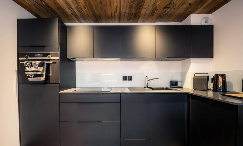 - Cuisine ouverte et équipée (plaque à induction, four, réfrigérateur, congélateur, lave-vaisselle, hotte, appareils à raclette, machine à café Nespresso, grille-pain, bouilloire, mixeur)
