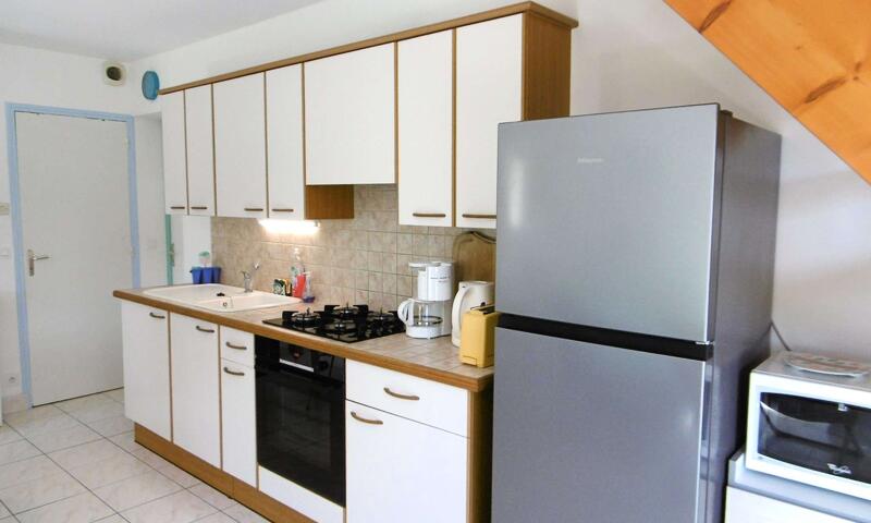 La maison est équipée d'une table de cuisson avec 3 feux gaz et 1 feux électrique, d'un réfrigérateur/congélateur, d'un four électrique, d'un micro-ondes, d'un lave vaisselle, d'une cafetière, d'une bouilloire et d'un grille-pain.