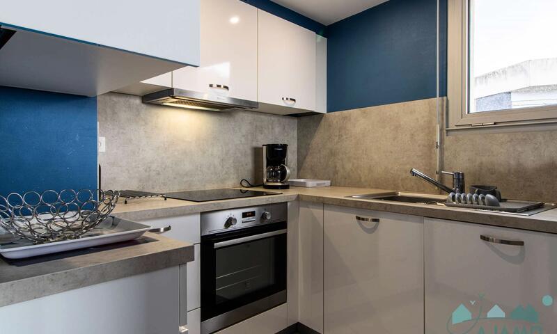 - Une cuisine ouverte, entièrement équipée : évier, plaques à induction (3 foyers), hotte, lave-vaisselle, four, réfrigérateur-freezer, micro-ondes, cafetière filtre, grille-pain, bouilloire, ainsi que de nombreux accessoires (planche à découper, ustensiles, poêles, casseroles, etc.) ;