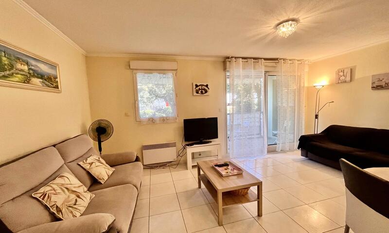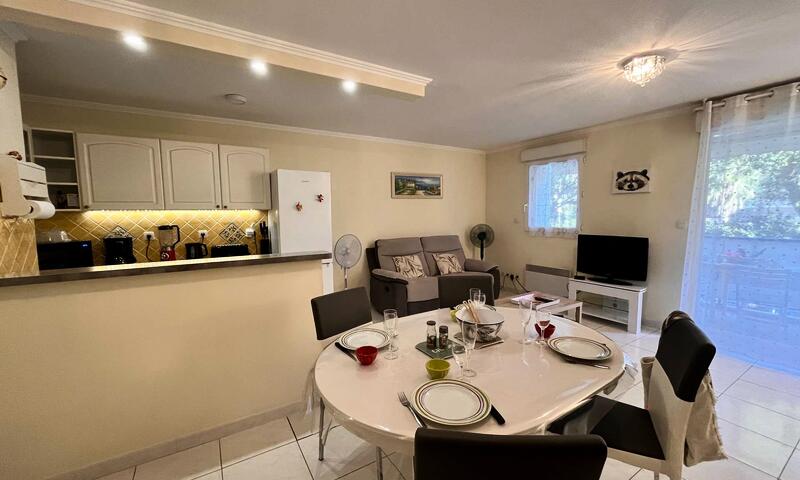 Il est composé d'un séjour spacieux avec un coin repas, le coin télé équipé d'un canapé convertible deux places et la cuisine aménagée.