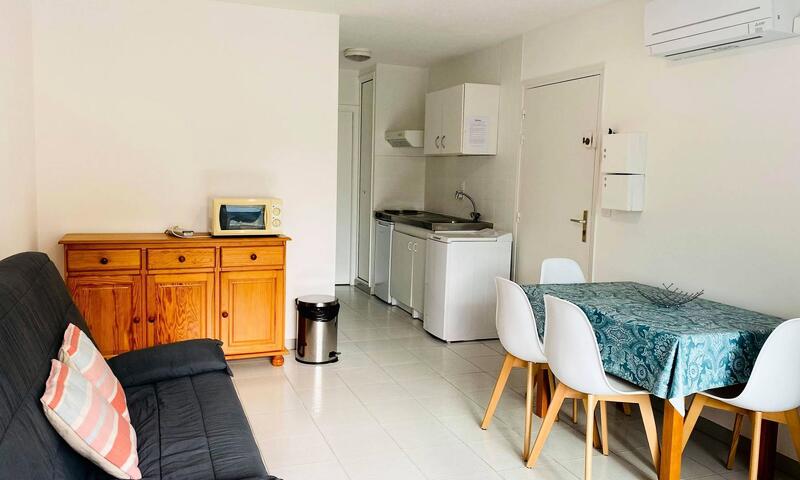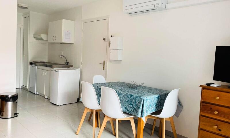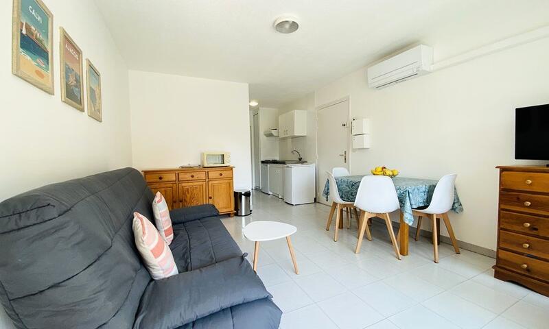 L' appartement est situé au 1er étage accessible par ascenseur et composé comme suit : une cuisine équipée ouverte sur un salon climatisé avec canapé convertible, 'une salle d'eau avec WC, une chambre avec un lit double.