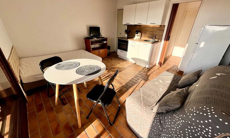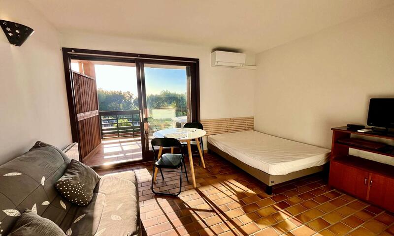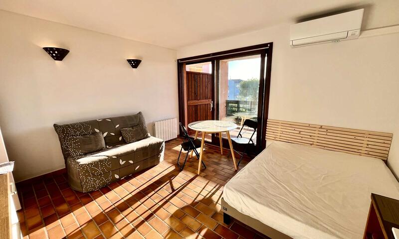 Dans une résidence calme avec piscine, cette location de vacances climatisée se compose d'une entrée, un coin cuisine, un séjour avec un lit deux personnes et un canapé clic clac, une salle d'eau avec WC.