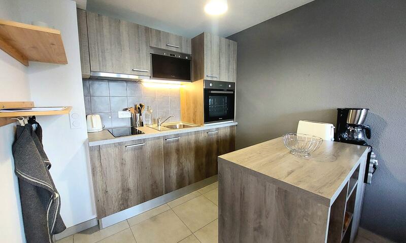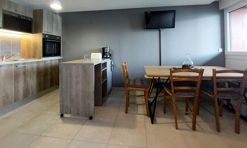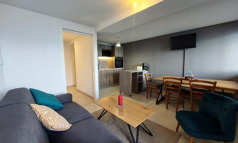 Salon/séjour ouvert sur la cuisine équipé d' 1 canapé convertible en 140cm et d'une TV.