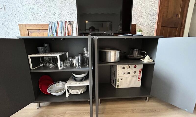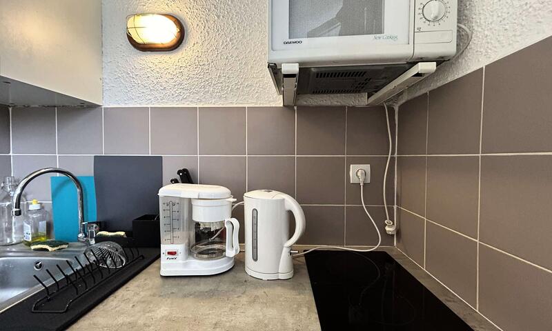 Ce studio de montagne comprend deux lits superposés dans le coin montagne, un canapé gigogne pour deux personnes dans le séjour équipé d'une télévision, le coin cuisine avec plaques électriques, micro-ondes combi,cafetière...;   une salle de bains avec baignoire. Wc indépendants. Beau balcon.