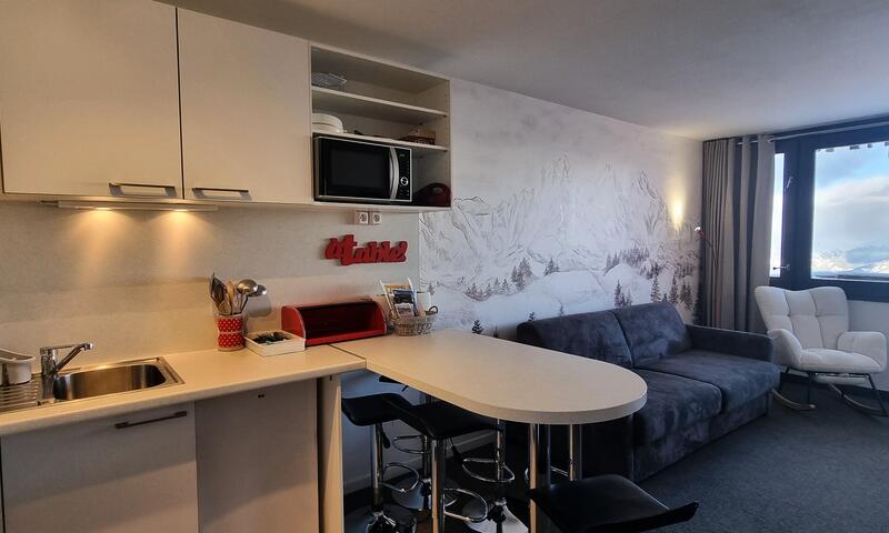 Ce studio rénové se trouve au niveau "N" du Paquebot des Neiges et est accessible par l'ascenseur "Diamant". Il se compose d'une cuisine ouverte sur le séjour, d'une chambre borgne, d'une salle de bains et d'un WC indépendant. Son balcon exposé Nord offre une jolie vue sur le Mont Blanc.