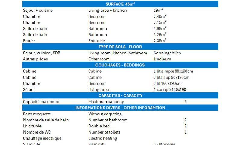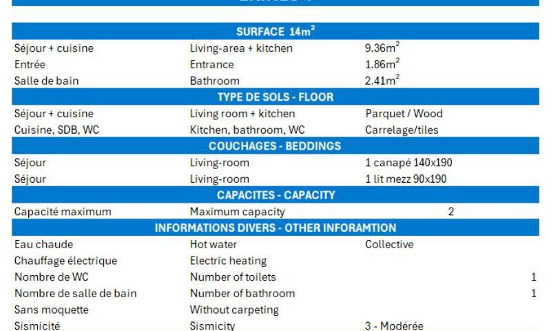 Séjour : 1 canapé lit 2 personnes (140 x 190 cm) et 1 lit en mezzanine 1 personne (90 x 190 cm)