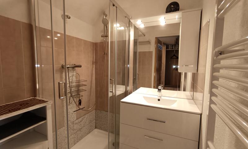 Salle d'eau : Cabine douche avec pare-douche, meuble + tiroirs avec vasque, grand miroir, sèche-serviettes électrique mural.
