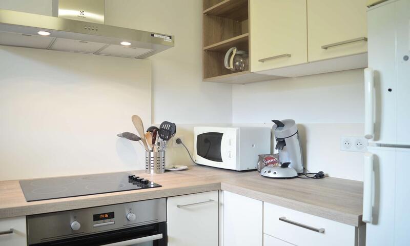 Cet appartement de vacances, situé au 5€ étage avec ascenseur, se compose d'un séjour équipé d'un canapé 2 places, d'une cuisine indépendante et entièrement aménagée, d'une chambre avec un lit double, d'une salle de douche et de WC séparés.
