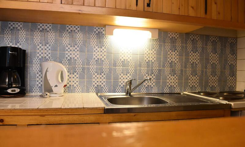 Cette location à la montagne, situé au niveau de l'entrée de la résidence, avec ascenseur, se compose d'une cuisine équipée ouverte sur le séjour avec le coin repas, un ensemble de lits gigognes relevables, un salon avec un canapé et une télévision.