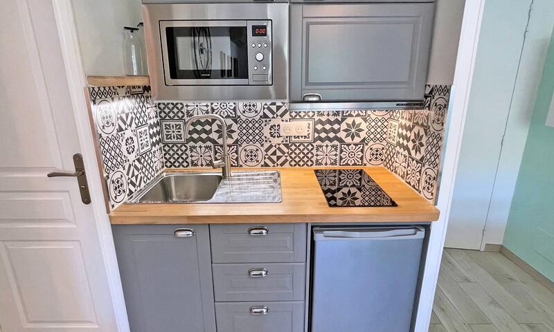 - Kitchenette : évier 1 bac, plaque de cuisson induction 2 feux, mini-four, micro-ondes, hotte, grille pain, cafetière Tassimo, cafetière à filtre, bouilloire, un petit réfrigérateur avec un petit compartiment congélateur, vaisselles et ustensiles divers