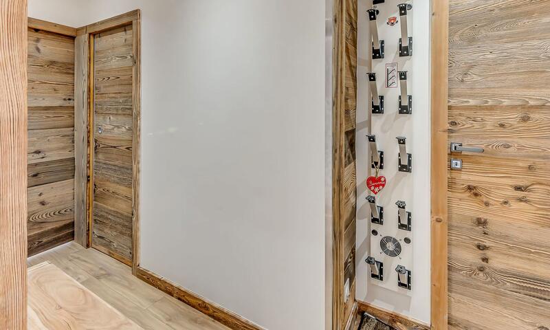 1 Entrée pour se déchausser, sol parquet vinyle, placard de rangement, radiateur de séchage des chaussures de ski.