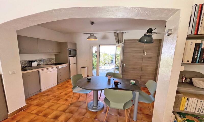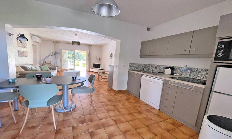 - Belle pièce à vivre climatisée avec cuisine équipée (réfrigérateur, congélateur, four, lave-vaisselle, cafetière, plaque de cuisson 4 feux) ouverte et coin repas, salon avec clic-clac 140cm et accès direct sur la terrasse
