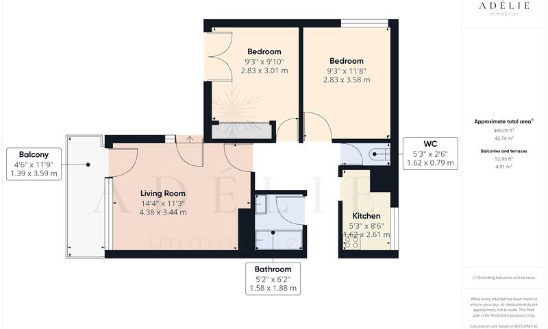 Séjour avec double exposition Sud et Ouest et accès à deux balcons. Canapé convertible 2 personnes 140*190.