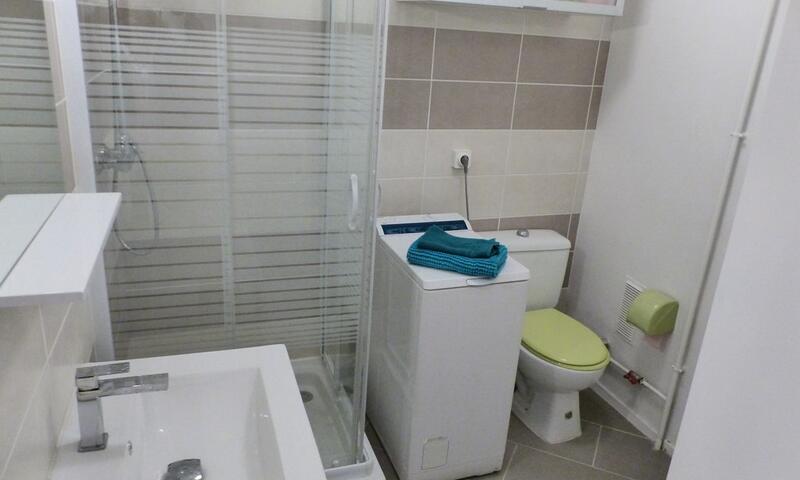 Salle de douche (2.12 x 1.73) : douche, vasque, WC et lave-linge.