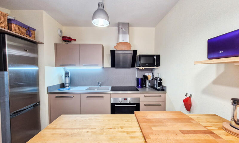 - Cuisine dans la salle de séjour avec grand réfrigérateur plaques vitrocéramiques, four, lave-vaisselle, micro-onde et cafetière à capsules